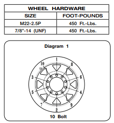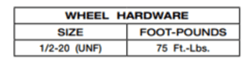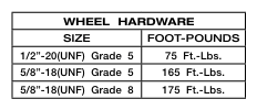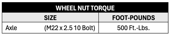 Verify torque on the wheel bolts. Check periodically until the wheel bolts remain tight (see wheel nut toque chart)