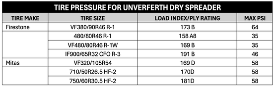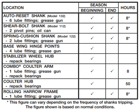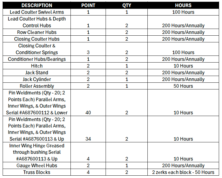 Lubrication: Ensure that autogreaser is set at the proper interval and full of grease. If cart is not equipped with autogreaser, ensure that grease bank lines are full and in good working condition. Grease hubs on wheels. All grease locations have purgeable seals.