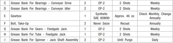 Grease the conveyor bearings and conveyor pivot points if not completed before storage.
