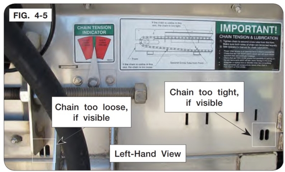 Verify drive belts or chains on double auger carts are properly tensioned and in good condition. The springs should measure 1 ¾” when belts are tensioned.