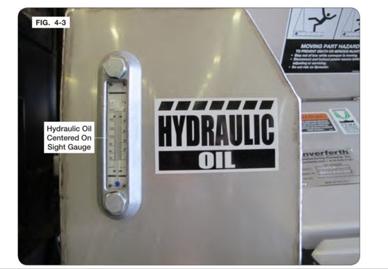 Verify the hydraulic oil level in the reservoir is 1" to 1.5” from the top of the sight gauge.