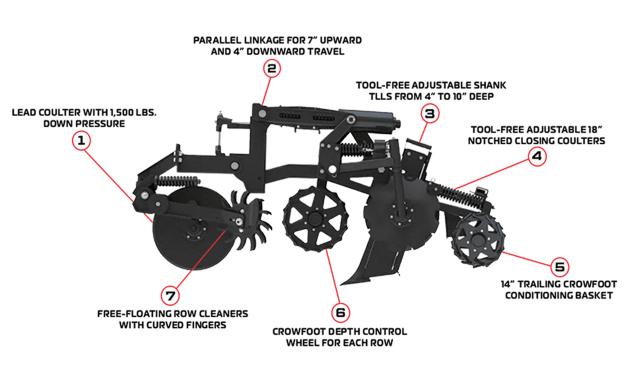 When the desired depth is set on the center section, set the main gauge wheels to match the center section depth (adjustable in ½” increments).